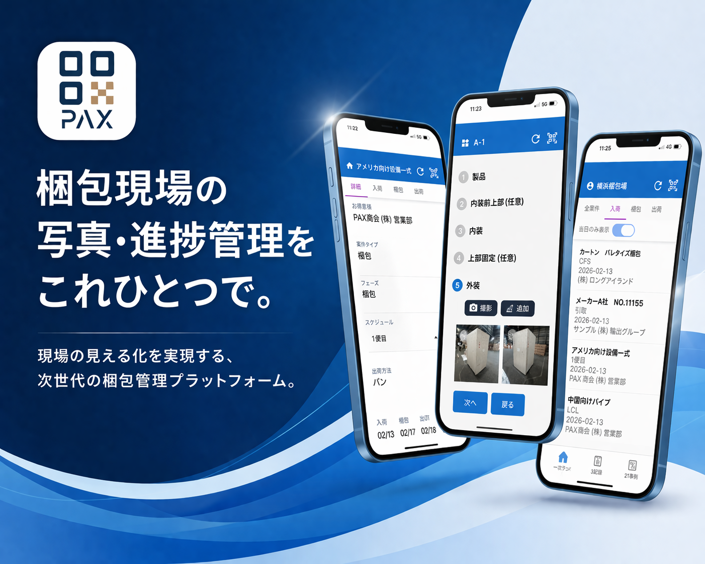 デスクトップ版PAXとリアルタイムに連携し、梱包現場における「写真撮影」「進捗報告」「入出荷確認」 を効率化するモバイルアプリです。